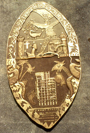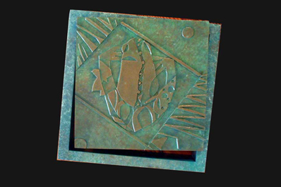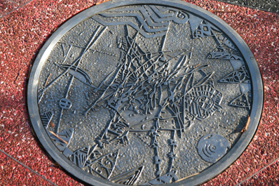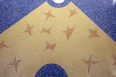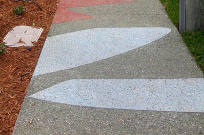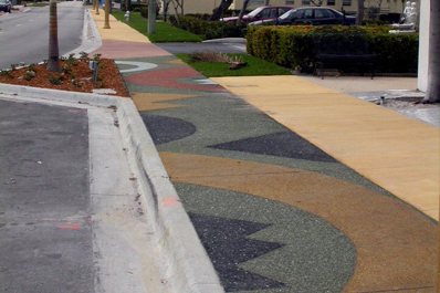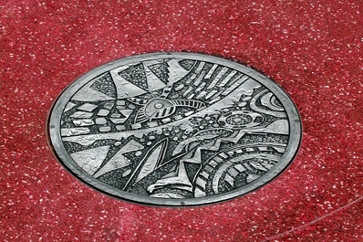 Concrete brick pavers, cast bronze medallions, rustic terrazzo