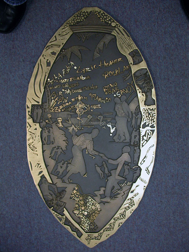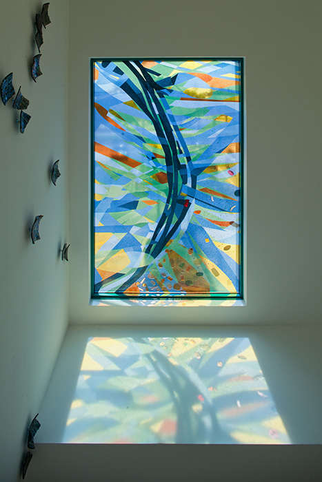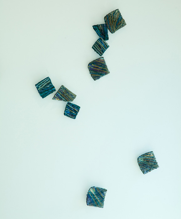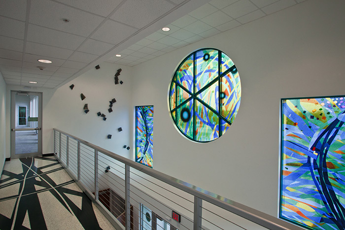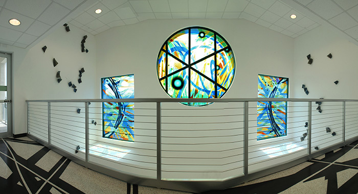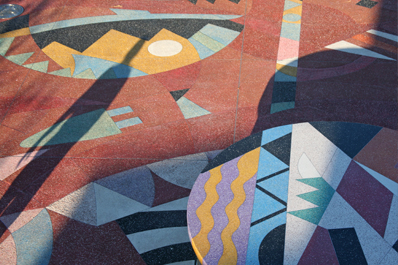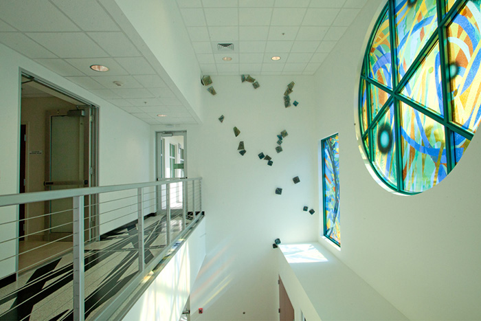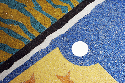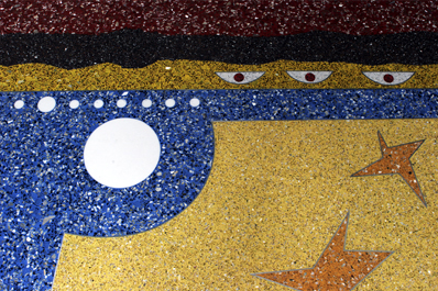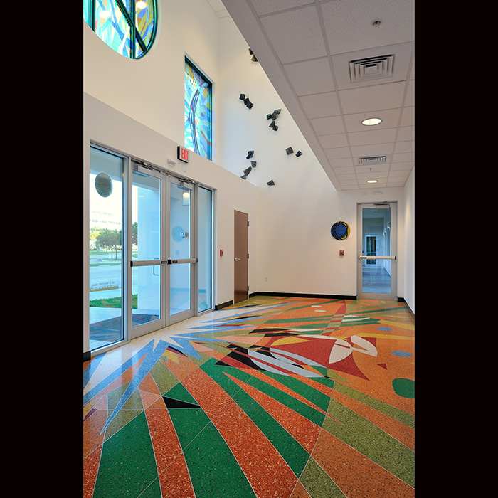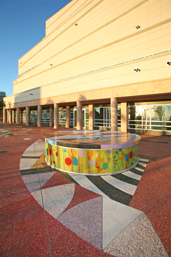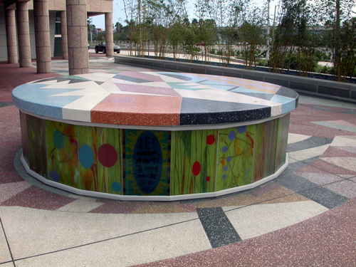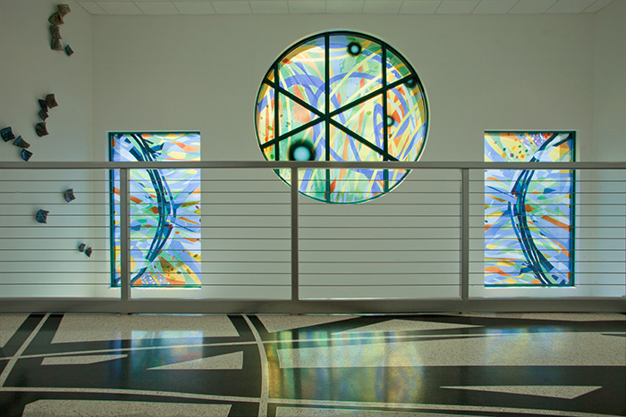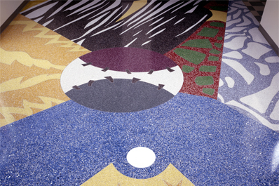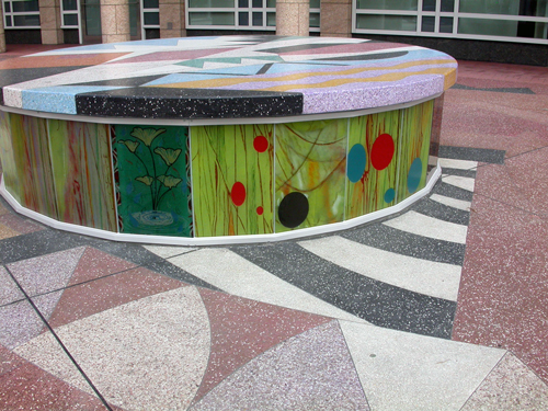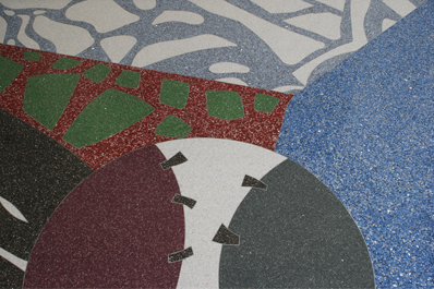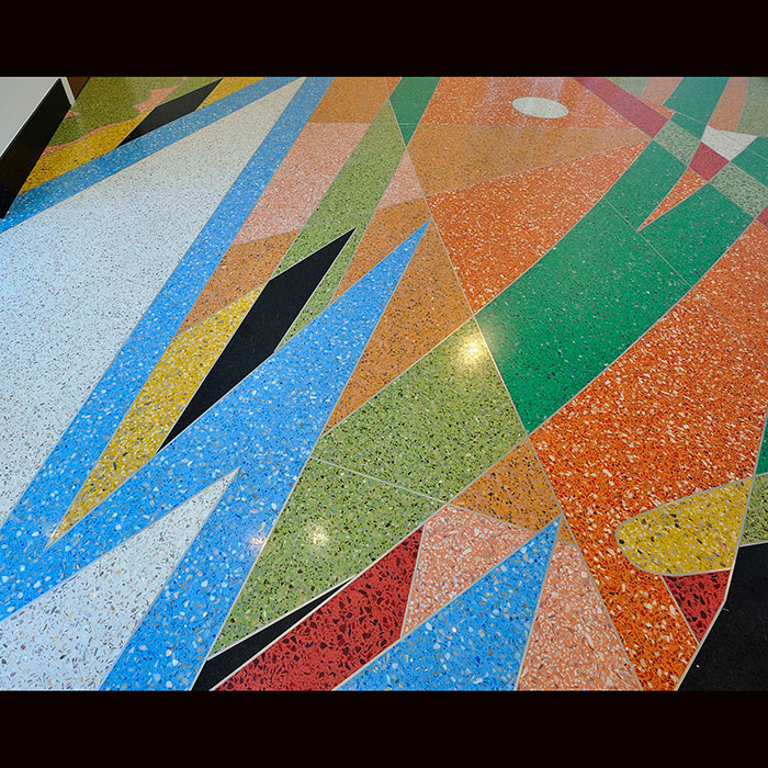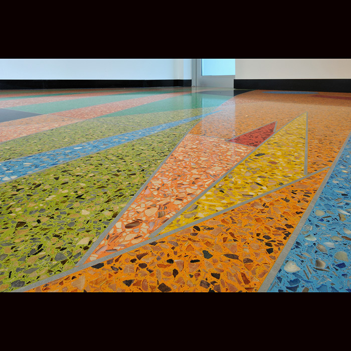 Rustic and polished terrazzo, cast chrome medallions, enamel on fused glass