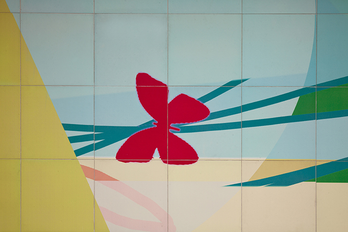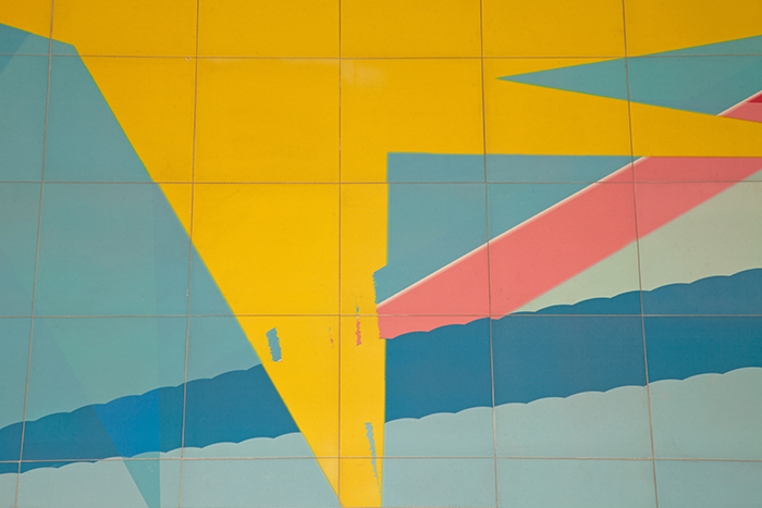 Silk-screened enamel on tempered glass, fused glass, polished terrazzo, anodized aluminum
